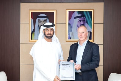 LRQA Chairman Martin Blackburn awarded Dubai Maritime City (DMC) the ISO 9001 certification for Property Management and Leasing at Jadaf, marking operational excellence.
