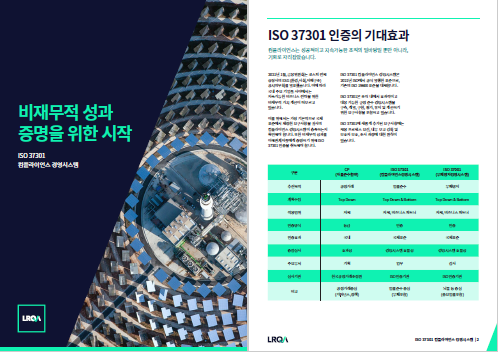 2021년 1월, 금융위원회는 코스피 전체 상장사의 ESG (환경,사회,지배구조) 공시의무화를 발표했습니다. 이에 따라국내 주요 기업들 사이에서는 지속가능한 비즈니스 전략을 위한 비재무적 가치 개선이 떠오르고 있습니다. 비재무적 성과를 이해관계자들에게 증명하기 위해 ISO 37301 인증을 취득해야 합니다.